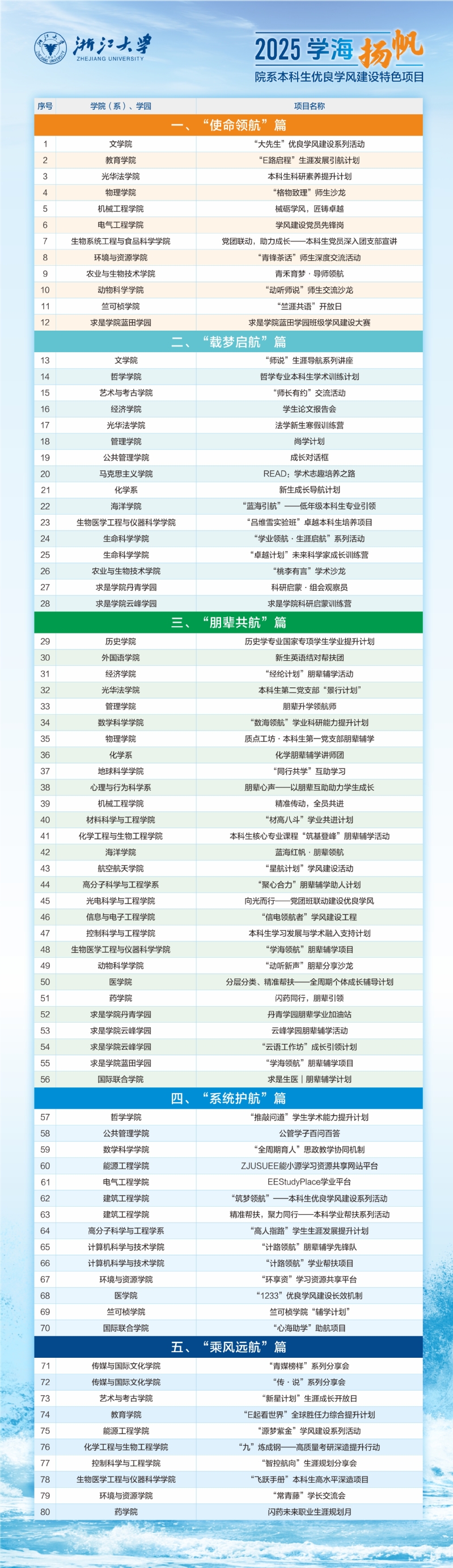 学风是大学精神的集中体现,学风建设是学校永恒的主题。2025年本科生优良学风促进行动实施以来,各单位积极响应。为进一步提升本科生优良学风建设工作质量,支持和鼓励各院系相关工作,经研究决定设立“学海扬帆”院系本科生优良学风建设特色项目,现予以公布。
